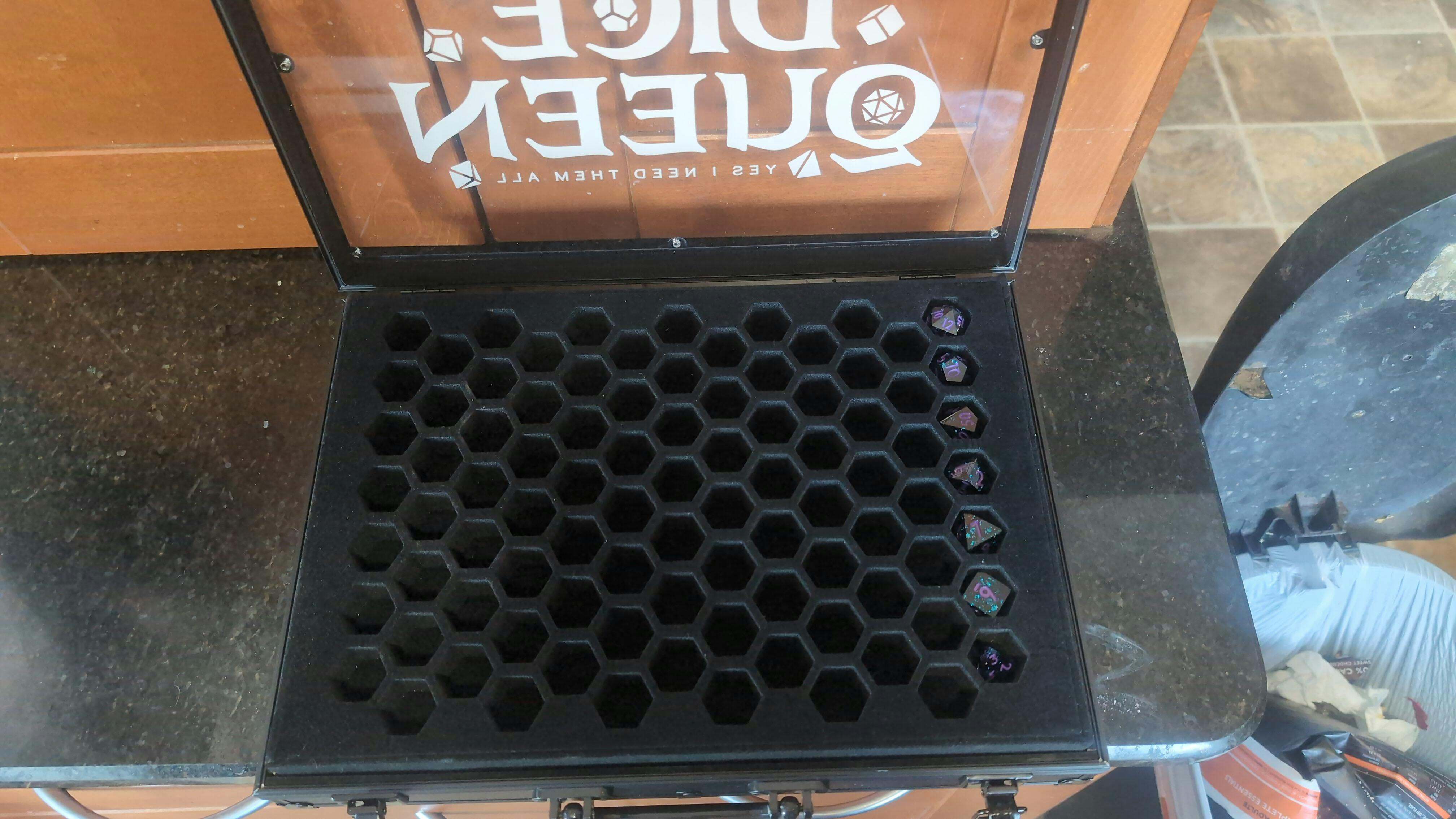 Our classic Chest of Hoarding is aluminum lined on the outside, with sturdy latches and handle for easy transport. Four rubber feet make it convenient to leave your case standing up for a smaller profile when storing (or for showing off on the game table). Our case is specifically designed to be "spill proof"- Meaning when you travel the gap between the foam and plexiglass top is calculated precisely to make sure none of your dice slip out of the slot and get all jumbled. And of course, the plexiglass cover is shatter proof!
