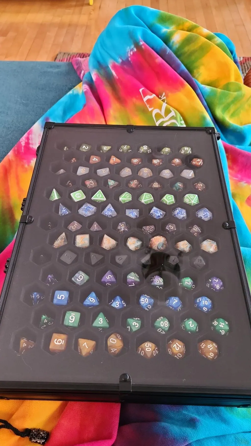 Our new upgraded case is aluminum lined on the outside, with sturdy latches and handle for easy transport. Four rubber feet make it convenient to leave your case standing up for a smaller profile when storing (or for showing off on the game table). Our case is specifically designed to be "spill proof"- Meaning when you travel the gap between the foam and plexiglass top is calculated precisely to make sure none of your dice slip out of the slot and get all jumbled. And of course, the plexiglass cover is shatter proof!